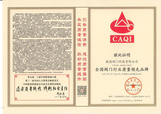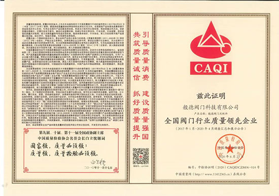 般德閥門榮獲CAQI“全國閥門行業質量領先品牌”、“全國閥門行業質量領先企業”、“全國質量檢驗信譽保障產品”。